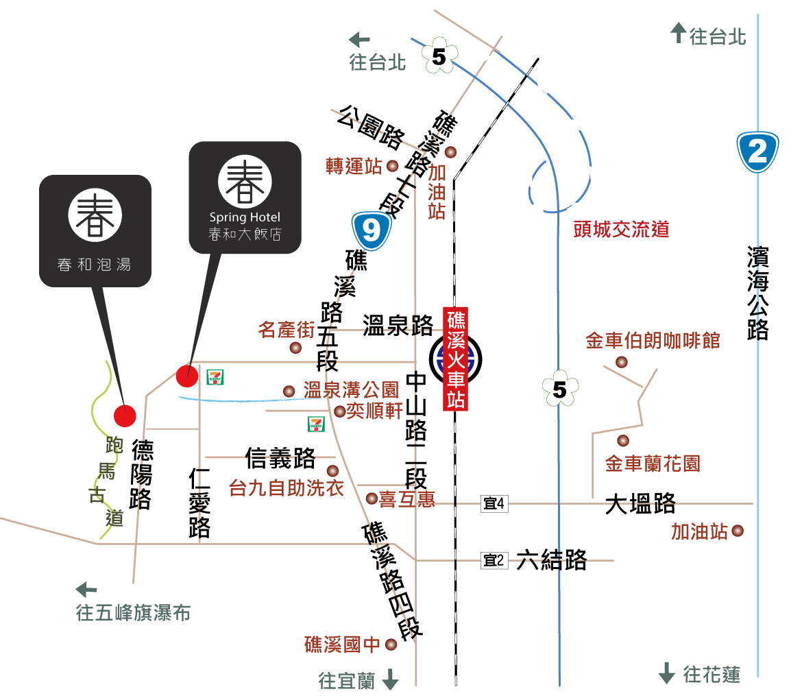 由北往南(自行開車):新店 → 北宜公路(台九省道) → 礁溪 → 德陽路見7-11左轉 → 春和大飯店 .基隆(或瑞芳) → 濱海公路(台二省道) → 頭城 → 礁溪 → 德陽路見7-11左轉 →